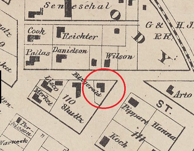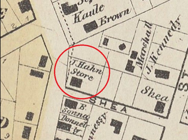 Image 4. W. E. Wood, “Map of the City of Houston, Sheet 2,” 1 January 1869. The grocery and homestead of J Hahn in the Fifth Ward. Image source: Beinecke Rare Book and Manuscript Library, Yale University, Digital Archives. Annotated by author.