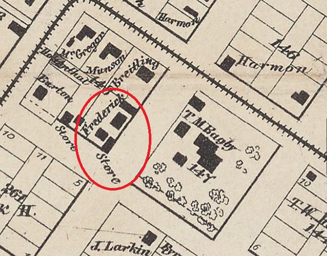 Image 2. W. E. Wood, “Map of the City of Houston, Sheet 4,” 1 January 1869. The grocery and homestead of William J Frederick in the Fourth Ward. Image source: Beinecke Rare Book and Manuscript Library, Yale University, Digital Archives. Annotated by author.