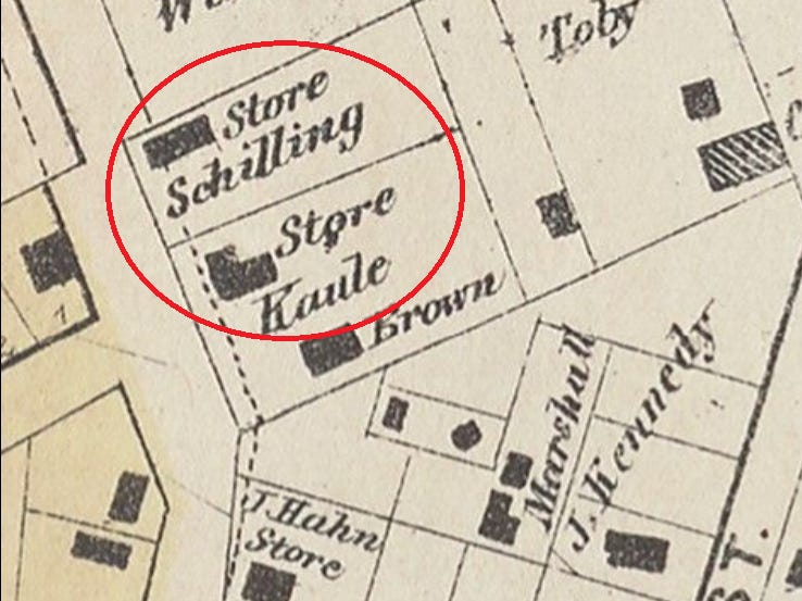 Image 3. W. E. Wood, “Map of the City of Houston, Sheet 2,” 1 January 1869. The grocery and homestead of A Schilling on Montgomery Road in the Fifth Ward. J Kaule also operated as a grocer in this neighborhood, but there is no confirmation that he resided there as well. Image source: Beinecke Rare Book and Manuscript Library, Yale University, Digital Archives. Annotated by author.